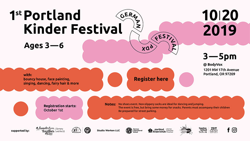Please join us for the 1st Portland Kinder Festival: When? 20th October 2019 from 3pm – 5pm Where? BodyVox1201 NW 17th AvePortland, OR 97209 Who?Ages 3-6 With:bouncy house, face painting, singing, dancing, fairy hair& more